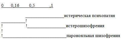 Каждой из изученных форм соответствует одна из горизонтальных ветвей дендрограммы: истерической психопатии - верхняя; истерошизофрении - средняя; паранойяльной шизофрении - нижняя.