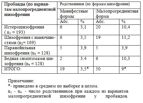 Факт накопления стертых, неманифестных форм эндогенных заболеваний в семьях больных шизофренией, впервые установленный J.Berze (1910) подтвержден в ходе последующих клинико-генетических исследований (А.Г.Галачьян, 1937; И.В.Шахматова-Павлова, 1972, 1975; M.Bleuler, 1930, 1962; H.Mitsuda, 1953, 1967; K.Planansky, 1966; D.Rosenthal, 1970, 1975; S.S.Kety, 1983). Однако, хотя необходимость анализа этих форм подчеркивается большинством исследователей, специальные работы по изучению структуры семейного отягощения при малопрогредиентной шизофрении до настоящего времени немногочисленны (В.Л.Шендерова,1974; G.K.Nyman, A.-K. Nyman, B.J.Nylander, 1978» P.H.Soloff, J.W.Mlllward, 1983; M.Вагоn et al., 1983-1985).