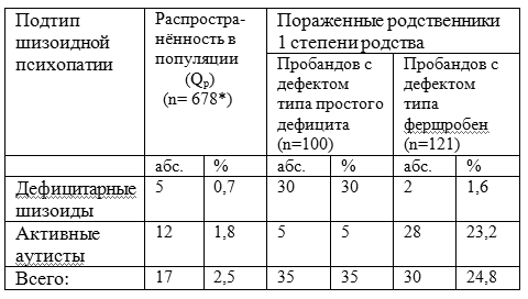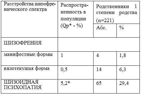 I.1,    Среди родственников I степени родства пробандов 37,5%составляют пораженные расстройствами шизофренического спектра (преимущественно шизоидной психопатией). Частота шизоидии в семьях - 29,4% (против 5,2 в общей популяции). Частота манифестных форм шизофрении – 1,8% (против 1% в общей популяции).