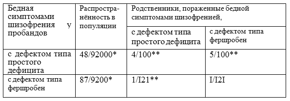 На основании приведенных фактов можно заключить, что бедная симптомами шизофрения, включающая варианты с дефектом типа простого дефицита и дефектом типа фершробен - относительно самостоятельная по своей генеалогической характеристике и генетически единая форма эндогенного процесса.