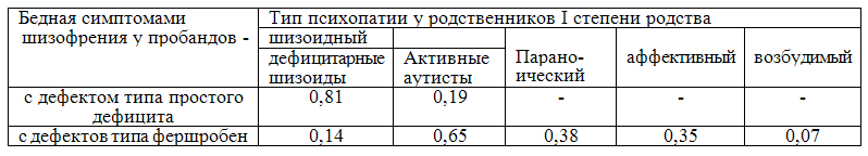 При бедной симптомами шизофрении с дефектом типа простого дефицита семейное психопатическое предрасположение ограничивается шизоидней, в то время как при бедной симптомами шизофрении с дефектом типа фершробен в семьях пробандов наблюдается накопление не только шизоидии, но и других психопатий - параноического, аффективного, возбудимого типов. Эти данные подкреплены результатами генетико-корроляционного анализа (таблица 6).