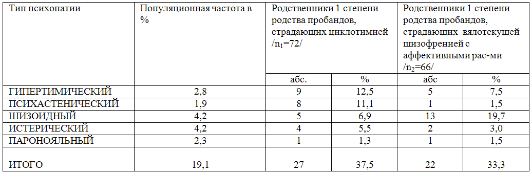 Значение показателя частоты шизоидной психопатии для родственников 1 степени родства при циклотимии у пробанда -6,9%- с учетом того, что клинически шизоидная психопатия в этих семьях включает в себя только один из подтипов, а именно - экспансивных шизоидов, становится более убедительным при сопоставлении с популяционным показателем шизоидной психопатии - 4,2%, вобравшему все подтипы шизоидии.