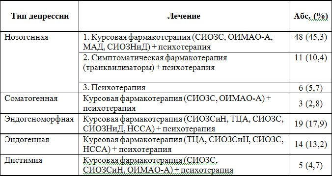 Нозогенные депрессии с синдромально завершенной психопатологической структурой являются объектом проведения курсовой фармакотерапии с использованием СИОЗС и МАД в стандартных терапевтических дозах, в некоторых случаях ОИМАО-А или СИОЗНиД в низких/средних дозах. Лечение субсиндромальных нозогенных расстройств может осуществляться и в режиме симптоматической фармакотерапии с помощью современных анксиолитиков, обладающих тимоаналептическим эффектом, а в ряде случаев ограничиваться только психотерапевтическим воздействием. При соматогенных депрессиях при необходимости комбинированной медикаментозной терапии выбор антидепрессантов ограничен максимально безопасными в отношении кардиотропных эффектов препаратами групп СИОЗС и ОИМАО-А, назначаемыми в средних терапевтических дозах.