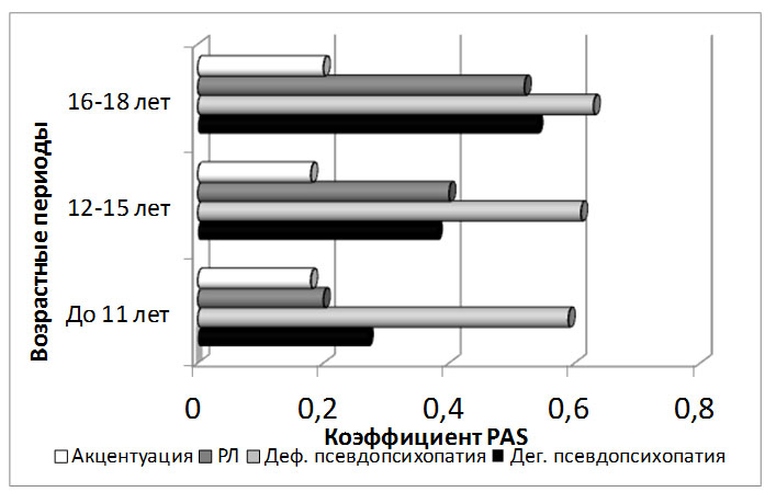 Были установлены различия между выделенными группами больных в различные возрастные периоды, которые представлены на рисунке 2. Ухудшение функционирования по мере приближения к манифестации заболевания ("регрессивный тип" динамики) с неоднозначной прогностической оценкой было характерно для пациентов II и III гр., у которых оно начиналось в раннем подростковом возрасте (с 12 лет) и было наиболее низким к манифестации заболевания, что отражает закономерность свойственную пациентам с заболеваниями шизофренического спектра [Cannon-Spoor H. et al., 1982; Rabinowitz J. et al., 2002; Schmael C. et al., 2007]. Однако в нашем исследовании данная закономерность, выявленная только у больных с РЛ и псевдопсихопатией, оказалась нехарактерной для большой группы больных, не имеющих на доманифестном этапе аномалий личности. Результаты, полученные у II группы больных, незначительно хуже данных полученных при обследовании пациентов с первым психотическим эпизодом в других исследованиях, в которые включались пациенты вне зависимости от возраста манифестации заболевания [Rabinowitz J. et al., 2002; Schemael C. et al., 2007]. Полученные результаты отражают более раннее формирование расстройств личности у изученных больных по сравнению с больными, у которых манифестация заболевания произошла в зрелом возрасте. Наконец, благоприятные для прогноза значения коэффициента PAS были получены в I группе больных.