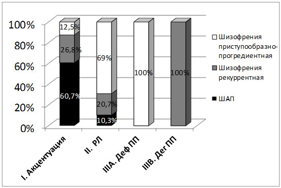 Также, в результате проведенного исследования была выявлена статистически достоверная (p<0,05) взаимосвязь между нозологической принадлежностью приступа и выраженностью личностной аномалии. Как видно из рисунка 4, для больных I гр. в 60,7% случаев было характерно развитие приступа в рамках шизоаффективного психоза (ШАП), в 26,8% случаев – рекуррентной шизофрении и лишь в 12,5% случаев - приступообразно-прогрединтеной шизофрении. У больных II гр. в 69,2% манифестный приступ развивался в рамках приступообразно-прогредиентной шизфорении, в 20,7% случаев – в рамках рекуррентной шизофрении, и в 10,3% - в рамках ШАП. Для больных из подгруппы IIIA в всех случаях была характерна приступообразно-прогредиентная шизофрения, а для подгруппы IIIB - рекуррентная шизофрения.