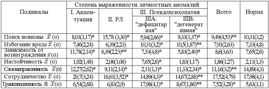 5.1. Психодиагностические данные, полученные с использованием методик TCI-125 и 5-NEO позволили выявить достоверные различия между группами больных с разной степенью выраженности личностной аномалии, а также дополнили результаты клинико-психопатологического метода.