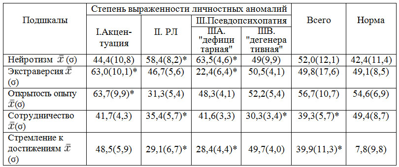При исследовании структуры личности с помощью шкалы 5-NEO (Пятифакторная шкала) [Costa P., McCrae R., 1990], результаты которой представлены в таблице 2, у всех изученных больных, в сравнении с нормальными значениями [Хромов А.Б., 2000], выявлена тенденция к повышению показателей по шкале "нейротизм" (p>0,01), снижению по шкалам "сотрудничество" и "стремление к достижениям" (p<0,01), что указывает на высокий уровень тревожности, при выраженном эгоцентризме и доминировании шизоидного радикала личности.