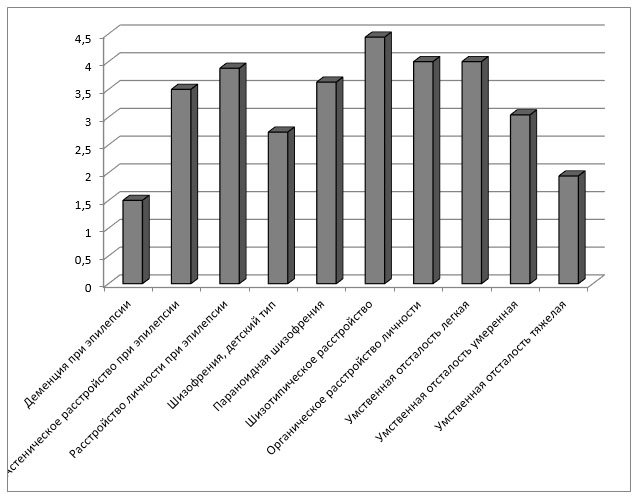 Нозологическое распределение обследованных пациентов было следующим: РШС – 41%; УО – 40%; психические расстройства вследствие эпилепсии – 11%; органические расстройства личности и поведения – 8%.