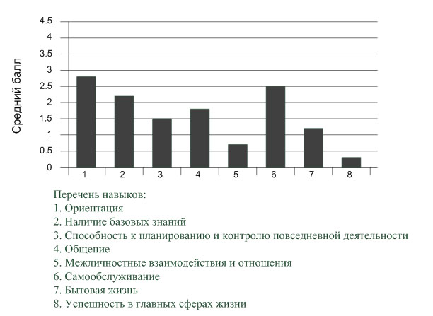 Согласно этой методике, больные шизофренией обнаруживали наибольшую несостоятельность в сферах: «общение» (преимущественно нарушенными оказались невербальное общение, сложные техники общения). Навыками из разделов «самообслуживание» и «бытовая жизнь» пациенты хотя и владели, но фактически реализовывали их редко, после стимуляции, напоминания. Умеренные и тяжёлые затруднения больные испытывали в овладении навыками, включенными в раздел «Межличностное взаимодействие и отношения в микросоциуме». Характерной была диссоциация в использовании простых и сложных навыков в повседневной жизни (выполнялись сложные, и не усваивались простые). Овладение основными навыками больными шизофренией представлено на рисунке 2.