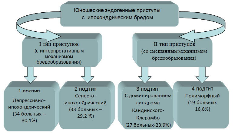 1. Приступы юношеского эндогенного приступообразного психоза с ипохондрическими бредовыми идеями феноменологически гетерогенны, демонстрируют различные механизмы бредообразования.