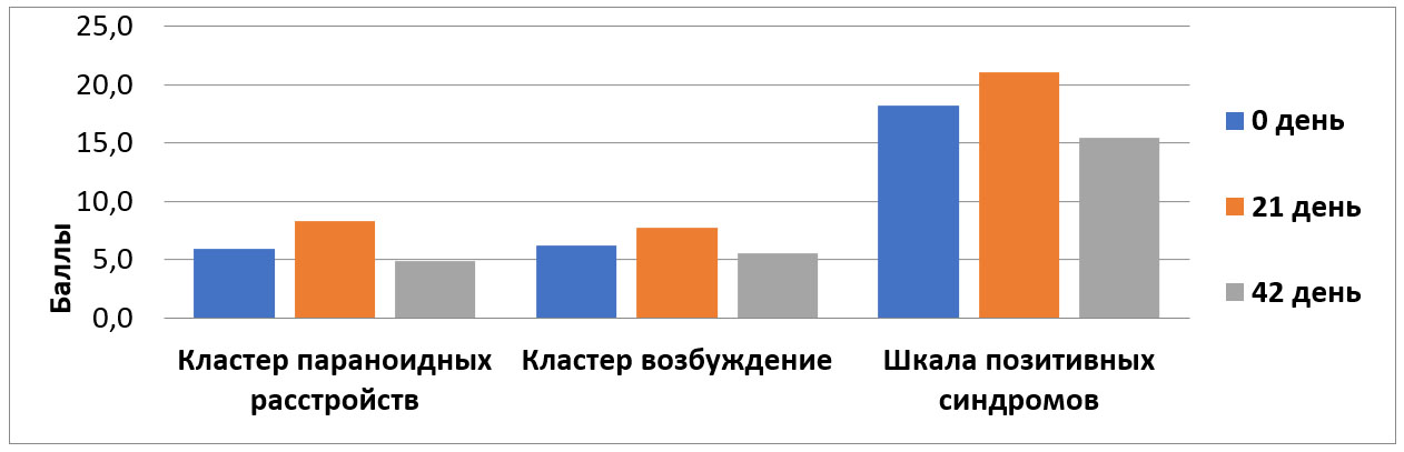 На момент включения пациентов в исследование психический статус исчерпывался стабильной картиной хронических бредовых расстройств с персекуторными идеями, сопровождающимися бредовым аффектом, негативизмом и замкнутостью. Окончание стимуляции в основной группе соответствовало повышению общего балла PANSS на 9,7% (p=0,007), а также увеличению оценок в кластерах возбуждения на 24,0% (p=0,002) и параноидных расстройств на 40,6% (p=0,002). Однако к моменту завершения исследования (42 день) общая оценка по PANSS снизилась на 5,43% (p=0,01), шкале позитивных синдромов на 15,4% (p=0,002), кластеру параноидных расстройств на 17,0% (p=0,038) и кластеру возбуждения на 11,3% (p=0,016), по сравнению с началом исследования, что свидетельствовало об эффективности психотропной терапии и преодолении резистентности (рисунок 4). В основной группе, в сравнении с контрольной, на 21 день исследования было обнаружено статистически значимое (p<0,05) повышение баллов на 16,9% в «кластере возбуждение», на 27,7% в «параноидном кластере» и на 18,5% по шкале позитивных синдромов. Однако к окончанию исследования все выбранные для анализа параметры в основной группе были достоверно ниже (p<0,05).