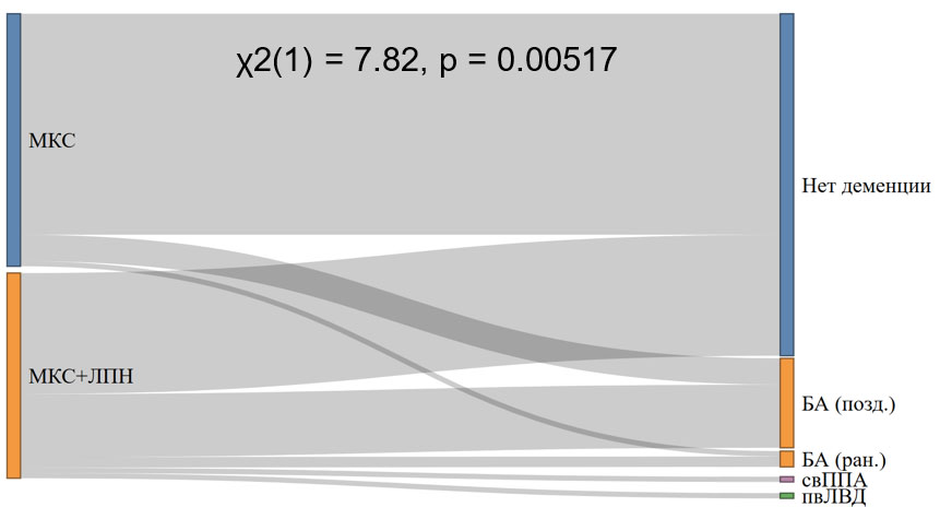 - Показано, что выраженность исходных когнитивных нарушений у пациентов с MКС связана с более быстрым развитием деменции: балл MoCA в начале исследования оказался в среднем на 2.7 балла ниже у пациентов с диагностированной впоследствии деменцией, значимость связи в модели была достоверной. Доля гиппокампального варианта амнестического типа синдрома MКС составила 77.2% среди всех случаев деменции, однако после учёта ЛПН в модели связь с исходом оказалась статистически незначимой;