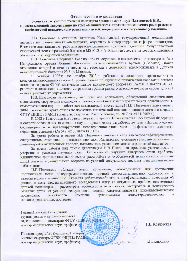 тел. 8-499-617-70-65) объявляет, что 17 марта 2014 года Платонова Наталия Владимировна представила диссертацию к защите на соискание ученой степени кандидата медицинских наук на тему: «Клиническая картина психических расстройств и особенностей психического развития у детей, подвергшихся сексуальному насилию» , по специальности: 14.01.06 – «психиатрия», медицинские науки.