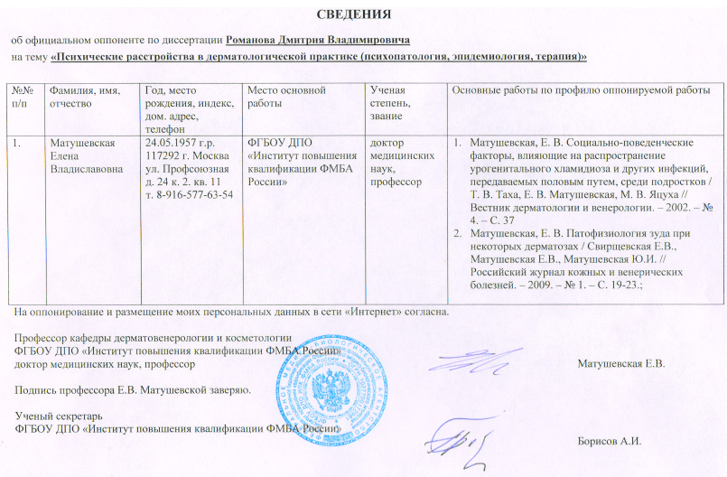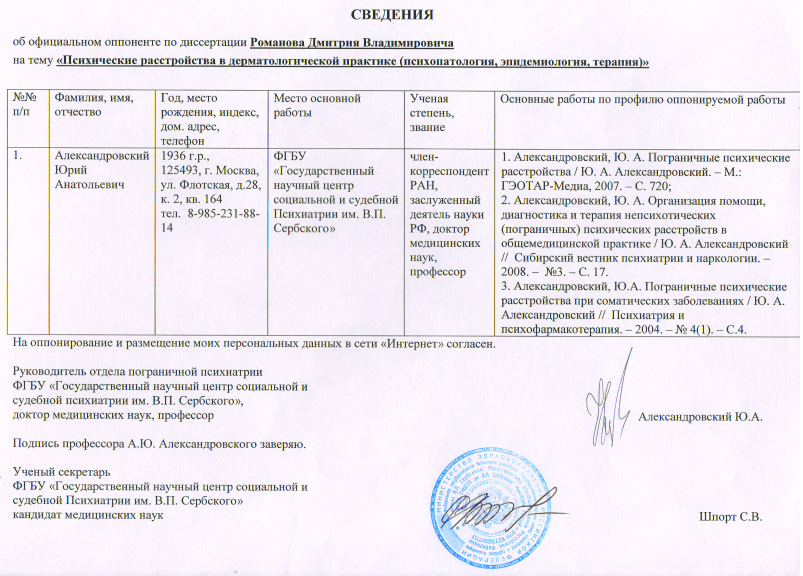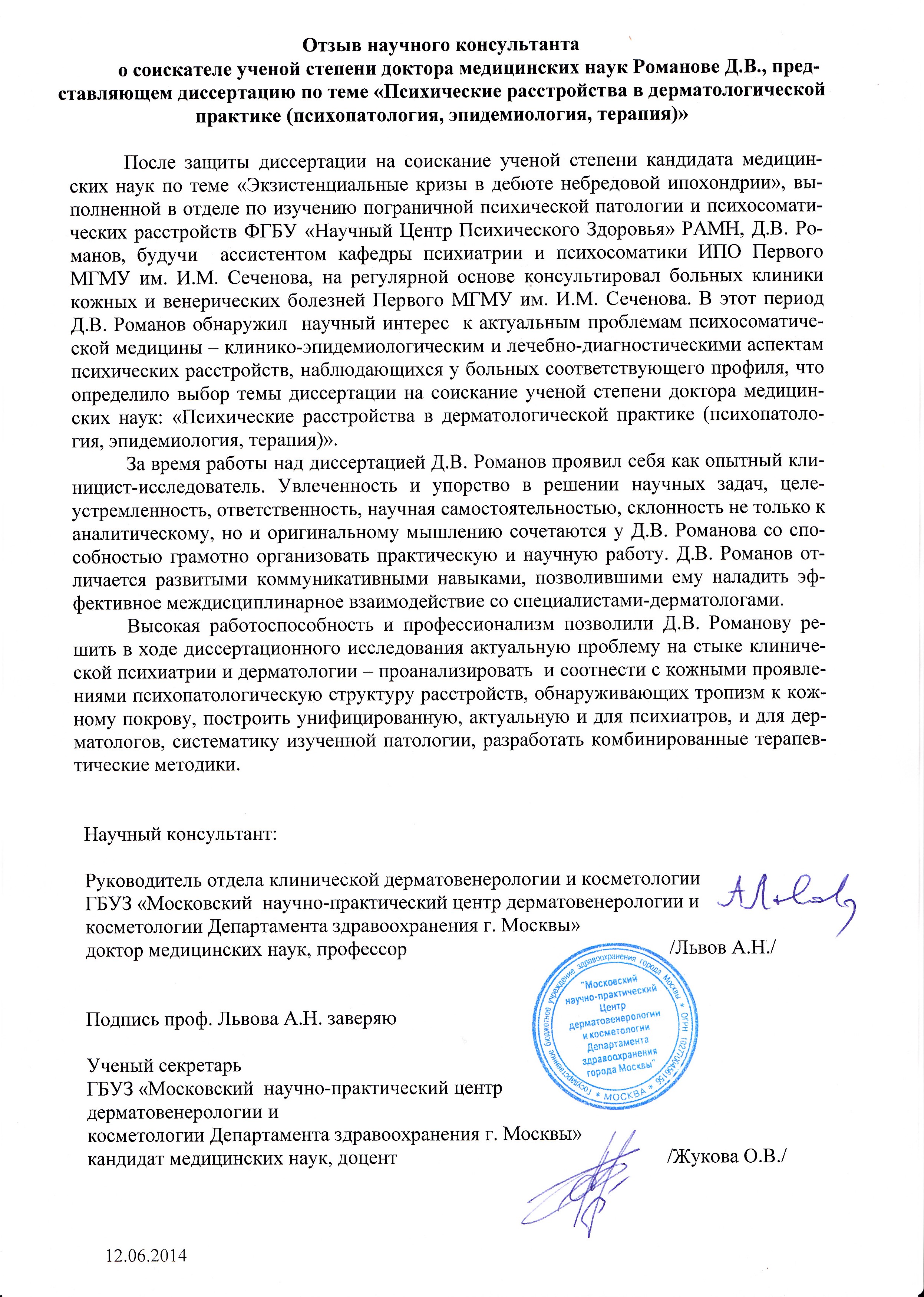 Диссертационный совет Д 001.028.01 при Федеральном государственном бюджетном учреждении «Научный центр психического здоровья» РАМН (115522, Москва, Каширское шоссе, д. 34, тел. 8-499-617-70-65) объявляет, что 30 июня 2014 года Романов Дмитрий Владимирович представил диссертацию к защите на соискание ученой степени доктора медицинских наук на тему: «Психические расстройства в дерматологической практике (психопатология, эпидемиология, терапия)», по специальностям: 14.01.06 – «Психиатрия» и 14.01.10 – «Кожные и венерические болезни», медицинские науки.