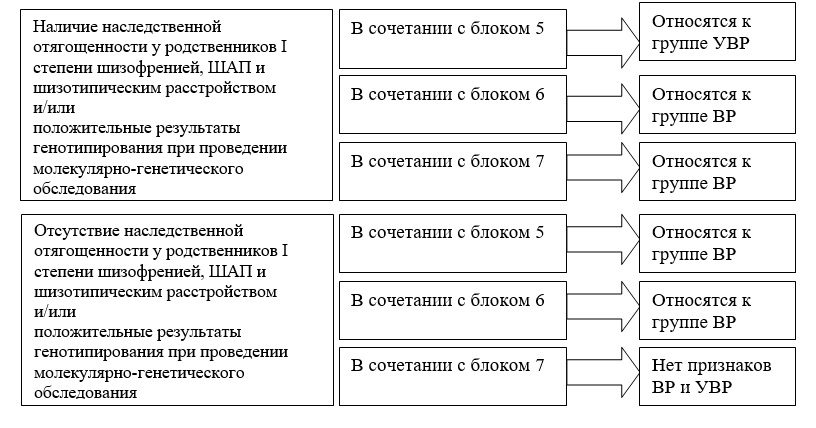 Понятия УВР и ВР устанавливаются с учетом наследственной отягощенности со стороны родственников первой степени родства такими расстройствами шизофренического спектра, как шизофрения, шизоаффективный психоз и шизотипическое расстройство. В случае доступности проведения молекулярно-генетического метода критериями риска служит выявление патогномоничных для ЭПП генетических аномалий [Thompson K. et. al, 2001], к которым относятся генотип СС полиморфизма Т102С гена рецептора серотонина и комбинации генотипа LL гена переносчика серотонина с генотипом мозгового нейротрофического фактора, содержащим аллель Met. Выбор этих генотипов обоснован данными литературы, по которым рецепторы серотонина типа 2а (5-HTR2A) обнаружены в передней коре и гиппокампе головного мозга, т.е. в участках, связанных с патологическими процессами, имеющими место при шизофрении. Оказалось, что их плотность снижена в мозге больных шизофренией по сравнению с психически здоровыми людьми [Hernandez L., Sokolov B., 2000]. В гене серотонина 5-HTR2A, расположенном на хромосоме 13, описан участок, в котором тимин может быть замещен цитозином в положении 102 – его обозначают как полиморфизм Т102С. В нескольких исследованиях сообщалось об ассоциации генотипа СС с шизофренией, а также с некоторыми ее клиническими проявлениями. Переносчик серотонина играет важную роль в регуляции этого медиатора за счет его обратного захвата из синаптической щели. В соответствующем гене на хромосоме 17 в районе, примыкающем к промотору, имеется полиморфный участок, представленный различным числом повторяющихся последовательностей (повторов) ДНК, обозначаемый в литературе как полиморфизм 5-HTTLPR (5-hydroxytriptamine gene-linked polymorphic region). В случае, когда аллель содержит 16 повторов, его называют длинным (L), при 14 – коротким (S). Показано, что активность экспрессии гена при наличии аллеля L выше, чем для аллеля S [Lesch K., Bendel D., Heol S. et al., 1996]. Ассоциация аллеля S с аффективными расстройствами, в том числе, депрессией, была описана в некоторых работах [Nellissery M., Fein R., Covarett L. et al., 2003; Nobile M., Cataldo M., Giorda R. et al., 2004; Hoefgen et al., 2005], однако связи полиморфизма 5-HTTLPR с шизофренией найдено не было [Serretti A., Lilli R., Lorenzi C. et al., 2002]. Нейротрофический фактор головного мозга (BDNF – brain-derived neurotrophic factor) активен в нейронах различного типа. Его функции связаны с дифференцировкой нейронов и формированием синапсов при развитии организма, а также с нейропротецией во взрослом мозге. Ген локализован на хромосоме 11 и содержит в одном из кодирующих участков однонуклеотидную замену, которая вызывает замещение валина на метионин в соответствующем белке. Этот полиморфизм, обозначаемый Val66Met, в последнее время интенсивно изучают у больных с различными психическими заболеваниями, в том числе с биполярными аффективными расстройствами [Neves-Pereira M., Mundo E., Muglia P. et al., 2002] и шизофренией [Neves-Pereira M., Cheung J., Pasdar A. et al., 2005]. Таким образом, выявление наследственной отягощенности у родственников I степени родства шизофренией, ШАП и шизотипическим расстройством или патогномоничных для этих заболеваний генотипов у самого больного позволяет отнести его к группе УВР или ВР.
